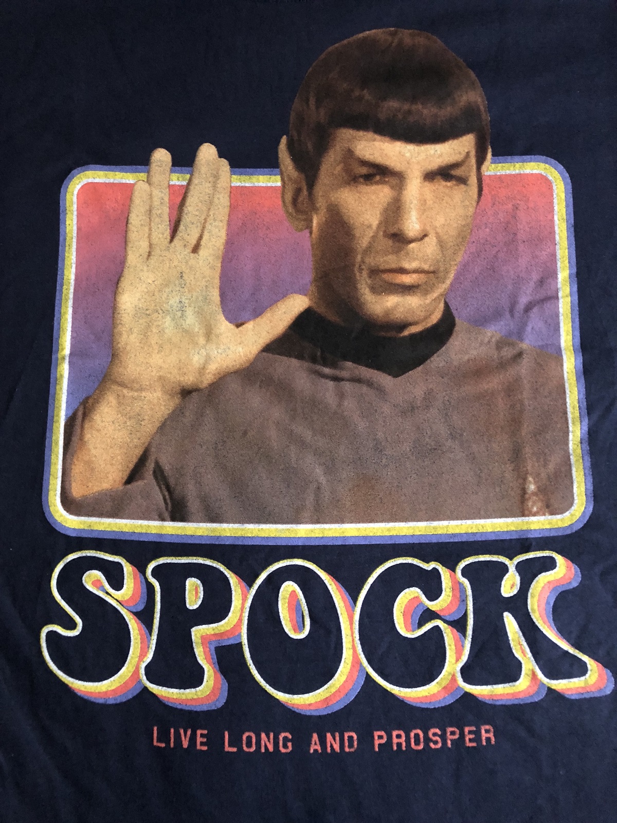 Now to the final item in the box, the make-or-break item: the t-shirt. This month we got this amazing Mr. Spock shirt in blue with a cool ’60s font and the classic pose with the Vulcan Salute. The shirt is essentially a four-color print with a piece of art from the show Photoshopped in, printed on a navy blue background. There was a possibility of getting another shirt that would have been Kirk on yellow, but we’re content with having Spock instead. It’s just more logical to us. This is a definate winner in our books and we’re happy to wear this around to the conventions coming this summer.