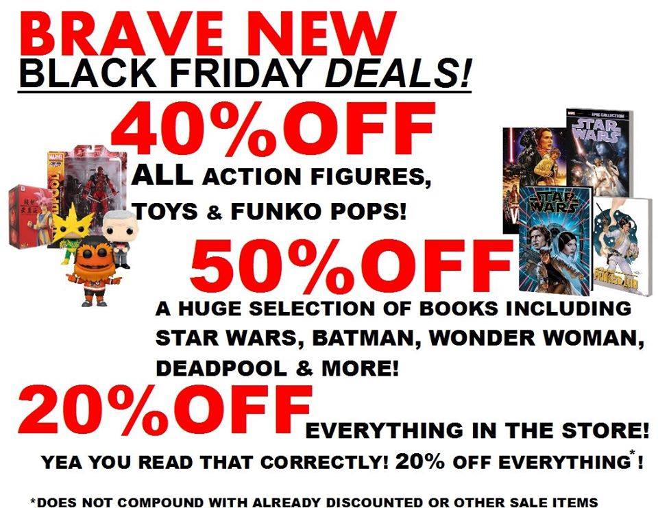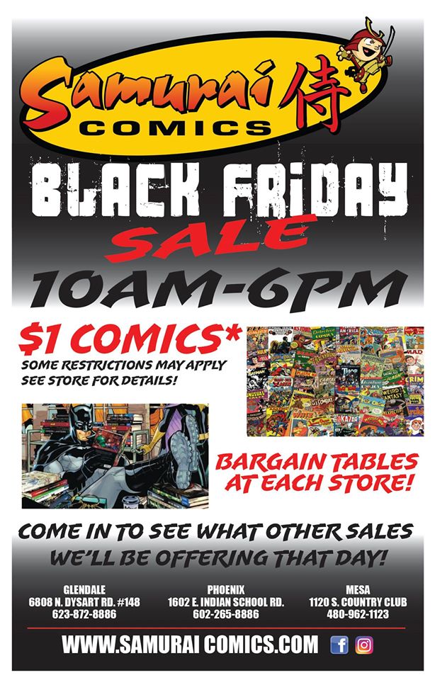 -FIVE DAY SALE: Black Friday 11/29 thru Tuesday 12/3-Save 40% OFF all new comics, back issues(excluding 11/27 new releases & case comics)-Save 20% OFF Everything else in the shop!!(including 11/27 new releases and case comics)-Doorbusters to save up to 75% OFF Items-1000’s of 3 for $1 comics -Sidewalk Sale (on some days)