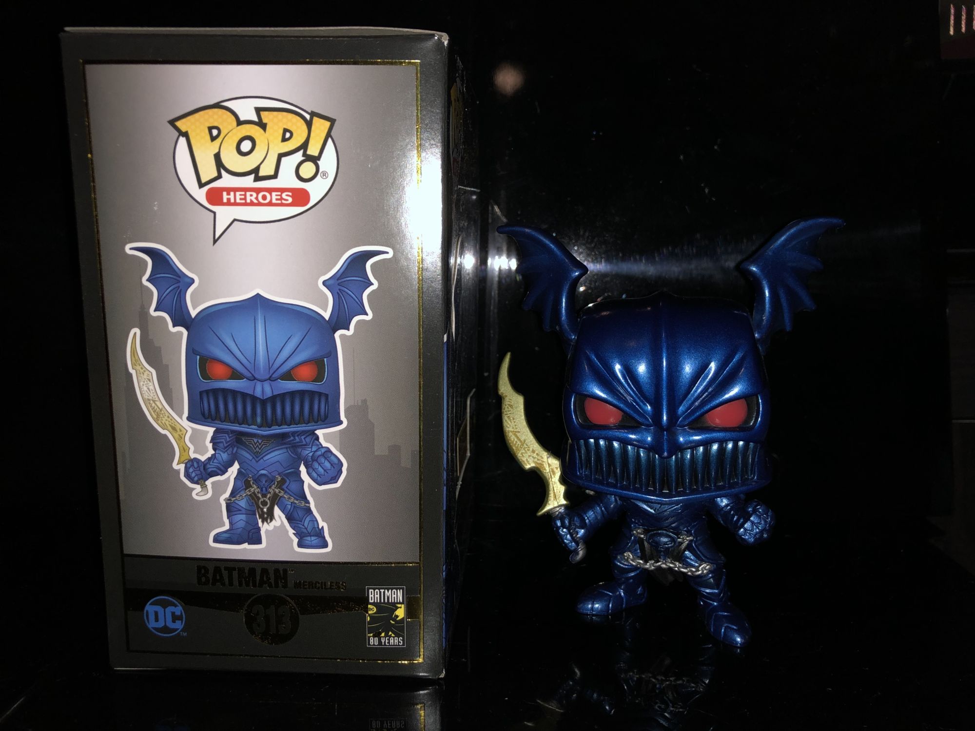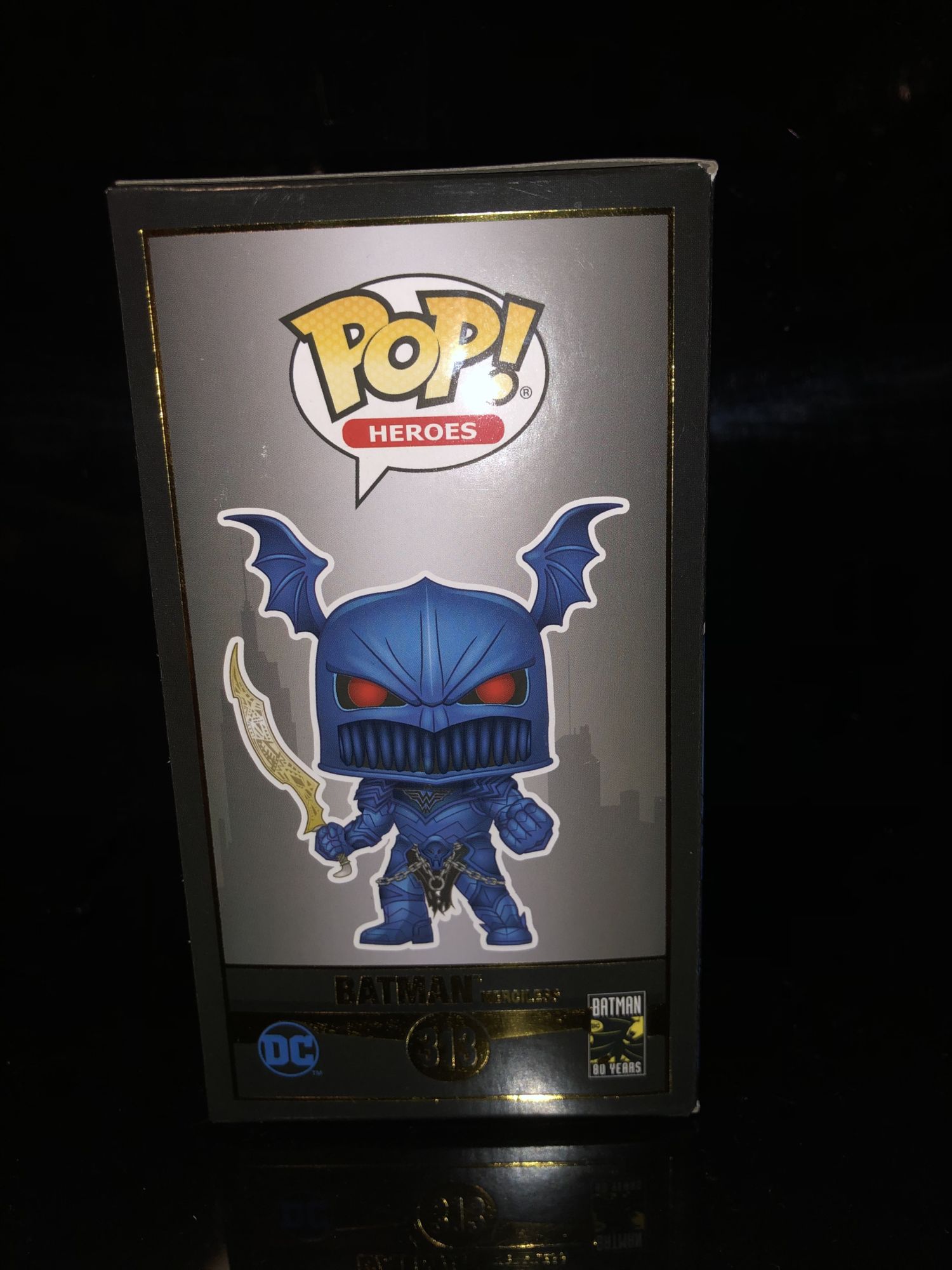 For starters, the box is quite different than other Funko Pop boxes it is featuring the newly used black packaging with the Batman 80th anniversary logo on it. There is gold trim around it that shines and definitely gives a new aspect to the packaging. Three out of four of the Dark Nights: Metal characters I have the style black box and it really suits them. If you don’t know the history this is a Corrupted Batman wearing Ares the God of Wars Helmet after he kills Wonder Woman in a war-torn world.