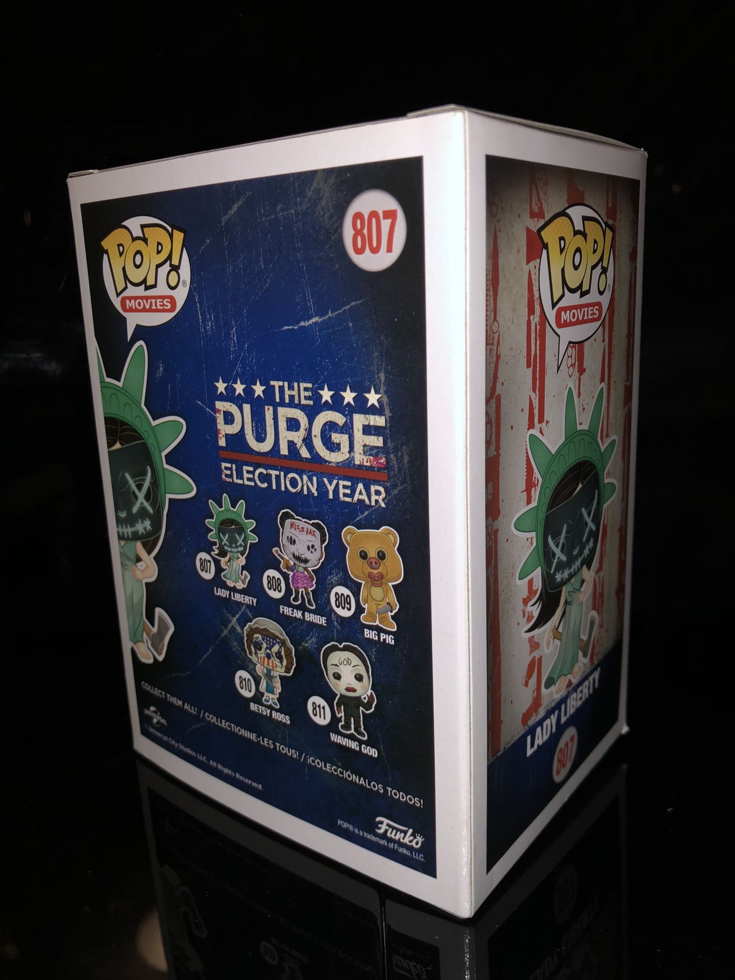 The Purge Lady Liberty Funko Pop vinyl figure is honestly one of the coolest designs to come out this year. For me, I really think it’s not only the design but the colors that they decided to use to bring this character to life. The packaging is quite simple and but the side is decorated with red, white, and blue with a variety of weapons across it. The back of the box shows the other characters released in this wave that is in stores now.