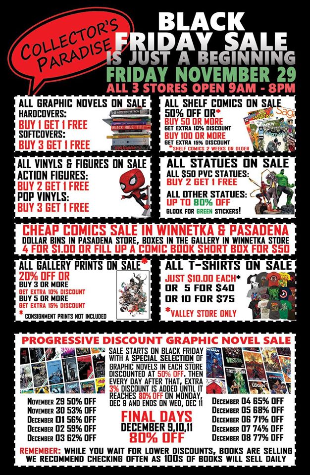 #1) Progressive Discount Table: We have an enormous table JAM PACKED with statues, action figures, graphic novels and more all starting at 21% off on Friday 11/22. Then on Saturday 11/23, everything remaining on that table is 22% off… then 23% off on Sunday 11/24… then 24% off on 11/25… then 25% off on 11/26… etc, adding 1% off the items each day UNTIL we hit Saturday, 12/21 when everything remaining on the table will be 50% off! That same day is our TMNT #100 signing, as well as the Epic Holiday Raffle kicking off at 5pm!