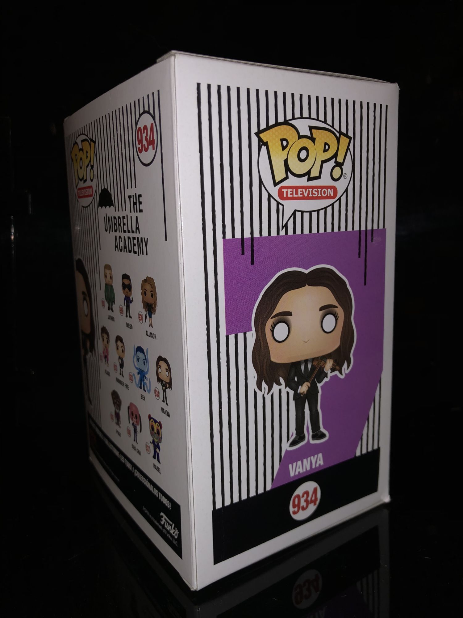 I am still quite surprised I was able to find a Funko Chase of this character on Black Friday in the middle of the day at GameStop. This Chase was definitely one I was after as it is a great Chase for any Funko Pop figure. Vanya is one of the main characters from the Umbrella Academy and her chase gives her a dark personality. But first, let’s look at the main one so you can see the difference once we hit the variant. The box is pretty simple and like every other Funko Pop box. However, the designs on our pretty unique as the side piece show the number that the character is. Also on the back top flap, there is a written quote for each of the characters. I happened to see this by accident and I almost missed it. On the back, it shows all the characters coming in this wave that we will be reviewing later on.