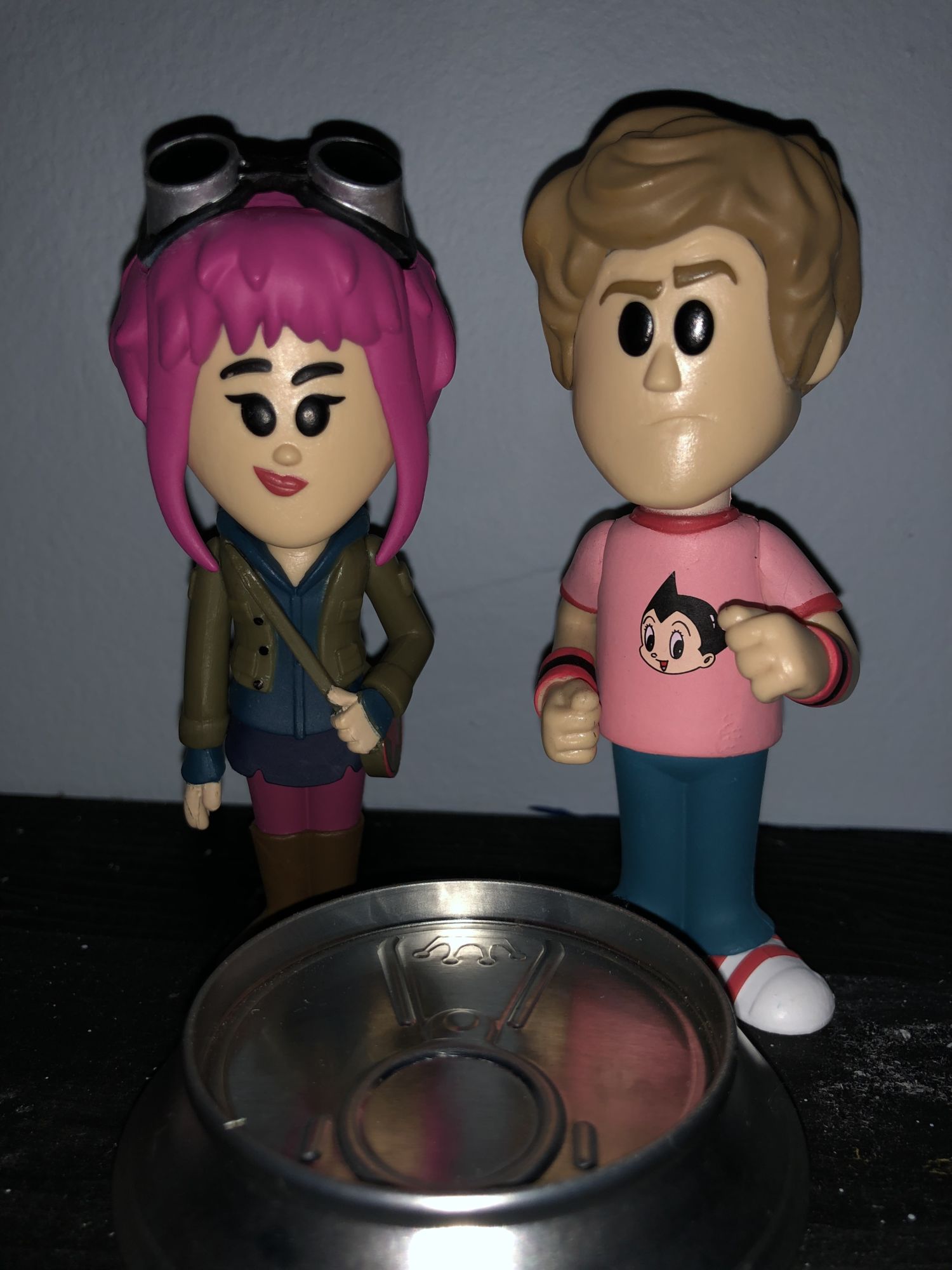 First up is the main man himself, Scott Pilgrim. His can shows off a blue/ yellow letter coloring and a cartoon style of him in the center. The cartoon depiction of Scott Pilgrim does throw off a lot of Michael Cera vibes which is pretty interesting. The figure itself is a pretty simple design, his hair is sculpted nice and his clothes are bright in color. He is wearing an Astro Boy shirt which is a nice little nerdy detail. The love interest Ramona Flowers is up next with her pink haired design. She is a little more detailed than Scott with her goggles, outfit, and purse which is nice. They both have a little bit bigger chins which are odd but not a complete turn away from owning them. Her colors are bright and she will defiantly pop on any collectors shelf.
