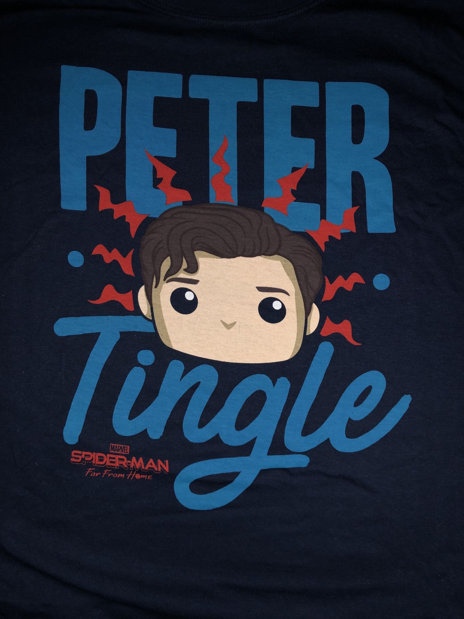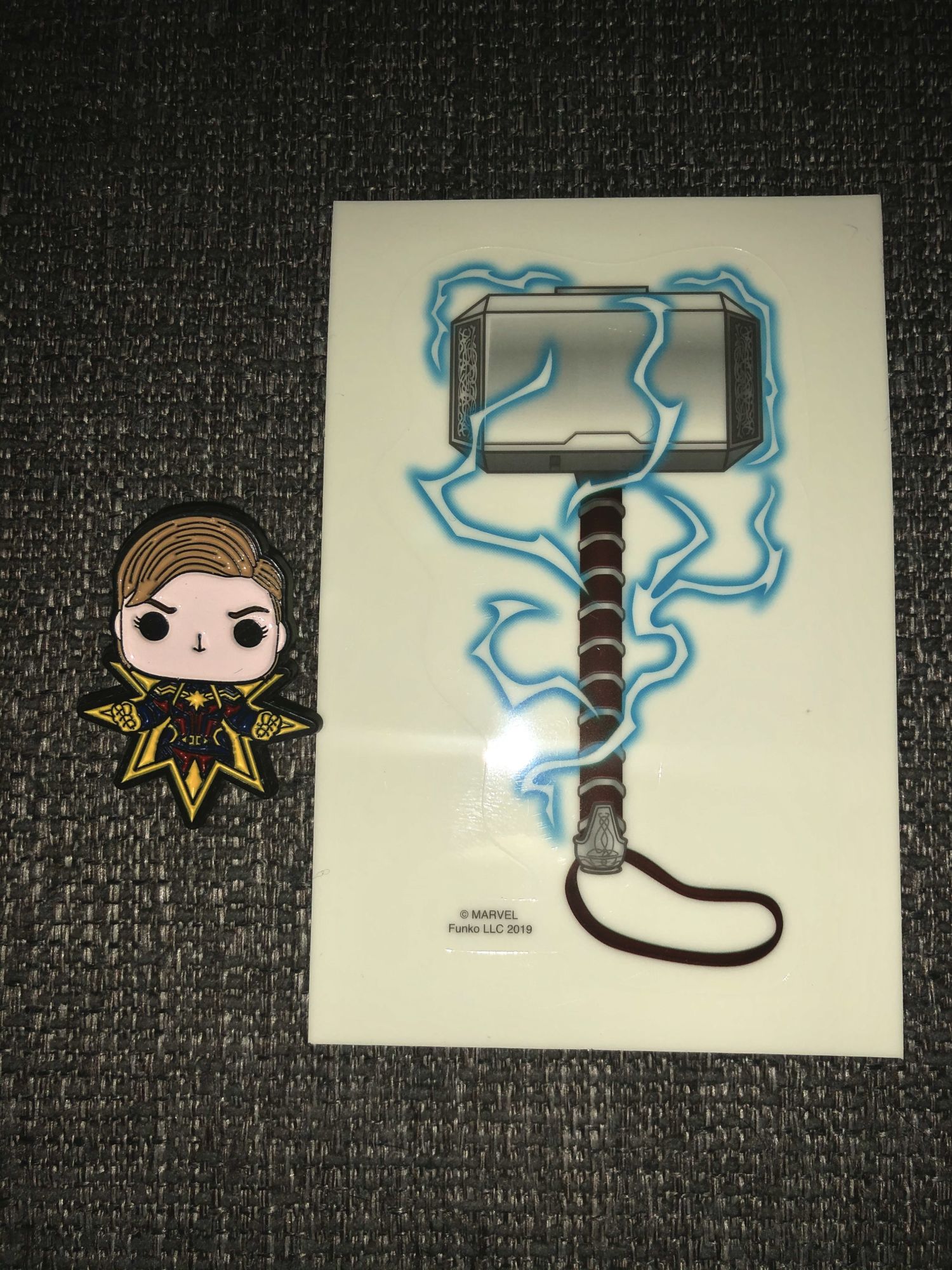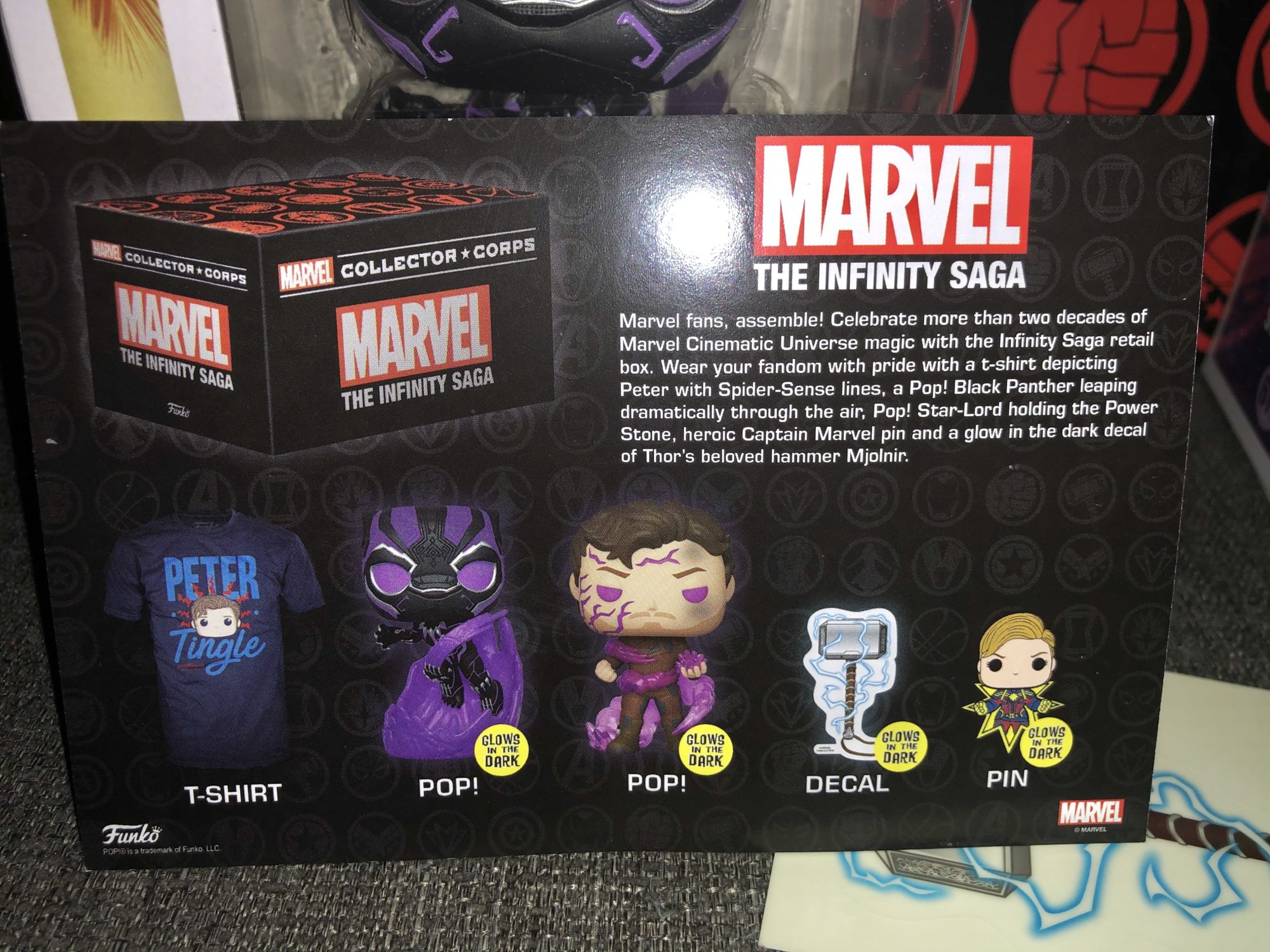 The box is nicely designed, it has the Infinity Saga words on the front and a huge variety of superhero logos on the top. Nothing is super crazy about the outside and I do miss the special cardboard boxes that the original Collector Corp boxes came in. Opening the box we are greeted with a nice variety of collectibles and of course, the shirt is on top. The shirt is from Spider-Man: Far from Home with the words "Peter Tingle" on them. This is obviously a reference to when Aunt May referred to Peter's Spider-Sense as a Peter Tingle, which is hilarious. I am a big fan of Funko and their shirts, they fit just right, comfortable and nothing wrong with showing your Funko support. Next up, we are looking at the little accessories that these boxes get. In this one, we are getting a Mjolnir hammer decal and a Funko Pop Captain Marvel pin. Both of these pieces do glow in the dark which a nice touch to make them stand out. The Captain Marvel pin is based on her Avengers: Endgame appearance which my favorite look of hers from Marvel Studios.