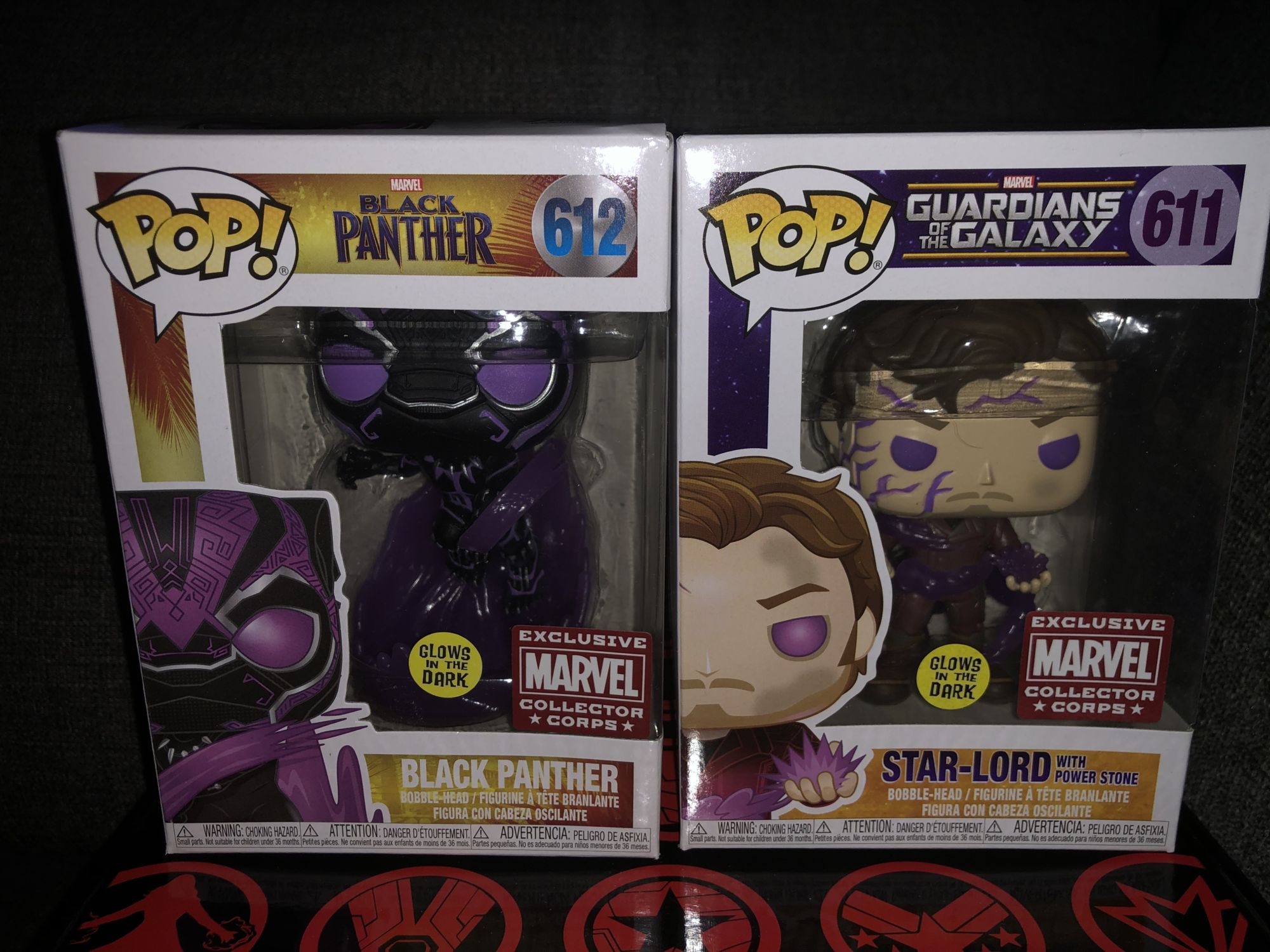 The last two pieces of the Amazon Exclusive Funko Marvel subscription box are, of course, the main event, the Pop Vinyls. These are the main collectible that collectors are trying to get a hold of and we have seen Movie Moments, single pops, two packs, and double Pop releases in these. This time we are getting a real treat as we are getting two Marvel Cinematic Universe Funko Pops! The first one is from Guardians of the Galaxy with Star Lord and the Power Stone. This figure does feature a glow in the dark element which is a beautiful touch. The glowing purple will really give it a very compelling touch. The purple etching on his face and in his eyes are very unique for this figure and I love that they went all the way back to 2014 for this design. Next, we are traveling back to 2018 for our next Pop from Black Panther. This Funko Pop also features a purple glow in the dark effect which is nice. This one is more than just the character as he is posed in a dynamic attack position and kinetic energy surrounding him. His base is purple and he is covered in elements of purple throughout his costume. This is based on his updated costume that can release excess energy stored up in his suit. Both of these figures feature purple elements which are pretty interesting but I love the added glow in the dark feature. It is really hard to narrow all of these movies down to a simple box but I am really pleased with these figures. Both series already have a nice set of figures but each brings a new dynamic pose to their collections. My favorite of the two is the Star Lord as it is a crucial scene of the movie and it's nice to have in solidify in a single collectible. I am looking forward to the next subscription box too like it for the next MCU film Black Widow.