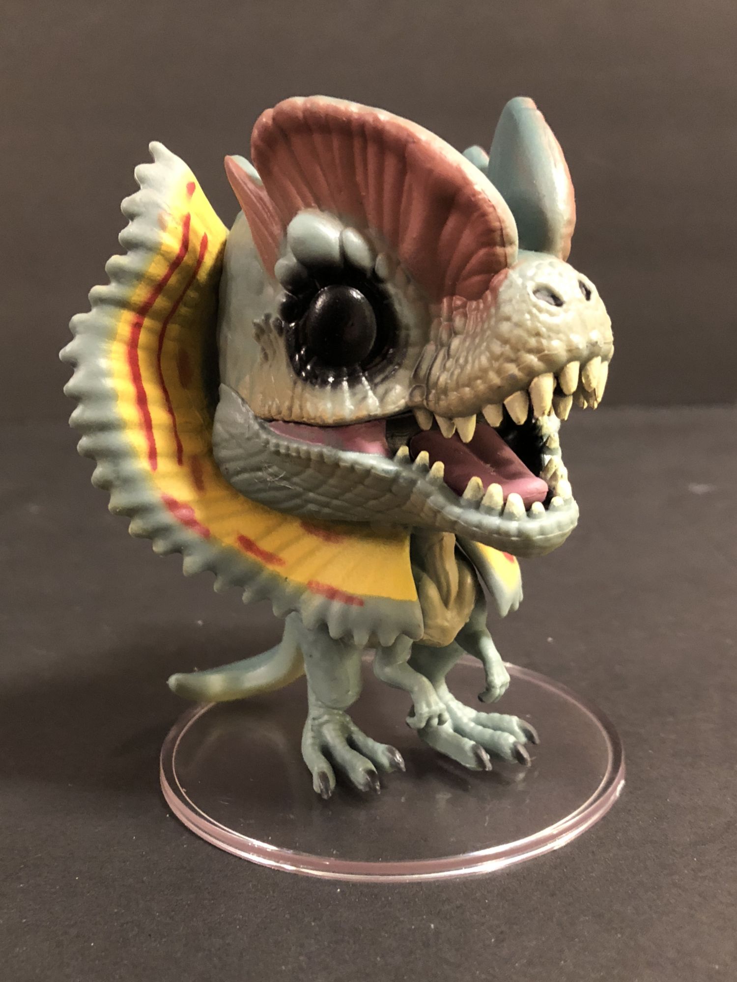 Probably the best sculpt of the three is the Dilophosaurus. The chase one does not have its cowl unfurled, which is a little boring. Good choice by Funko to make this one the regular release. The colors are amazing, and the cowl really adds a lot to the figure. This one also makes the best use of the standard Funko Pop eyes — they look the most natural on this one. By far my favorite.