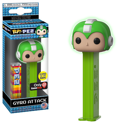 Sonic, Crash Bandicoot, and three different versions of Mega Man will be available. The green Gyro Attack glow in the dark dispenser is exclusive to GameStop.