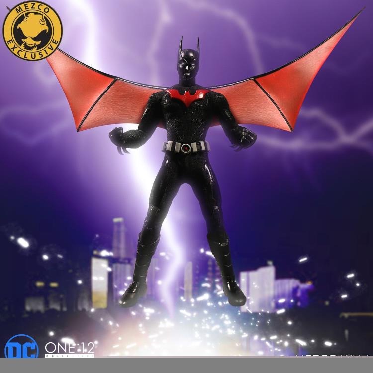 Flying on in next we are going to take a look at the special Mezco Toyz One:12 Collective Batman Beyond figure. This figure is beautifully crafted and perfect for any Batman Beyond fan. He has a nice slim bodywork with the iconic red symbol in the center. He does come with foot jet booster effects, batarangs, and a second interchangeable head. He even comes with wing accessories perfect for any posable flight positions. This is a figure any Batman Beyond fan should have and you can find them online here or through online retailers like eBay.